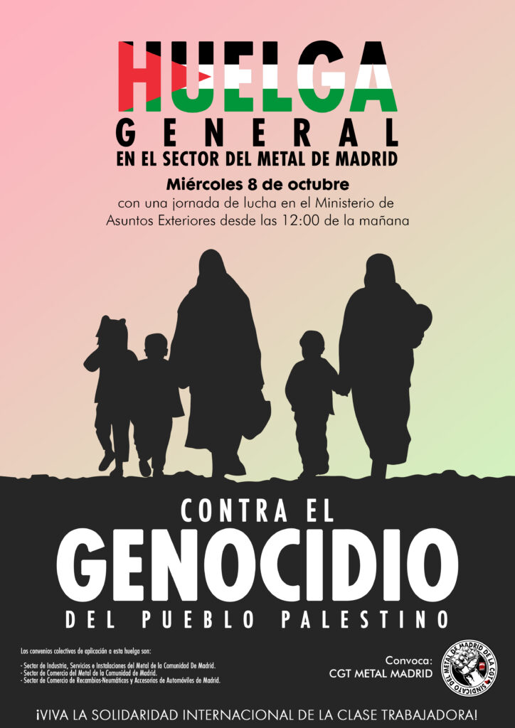 Desde CGT Metal Madrid, la asamblea decidió atender el llamamiento de los estibadores de Génova y convocar una jornada de huelga en el sector del metal en la Comunidad de Madrid. Una decisión que tomamos no solo como trabajadores y trabajadoras, sino también por pura humanidad ante el genocidio que se está cometiendo contra el pueblo palestino.